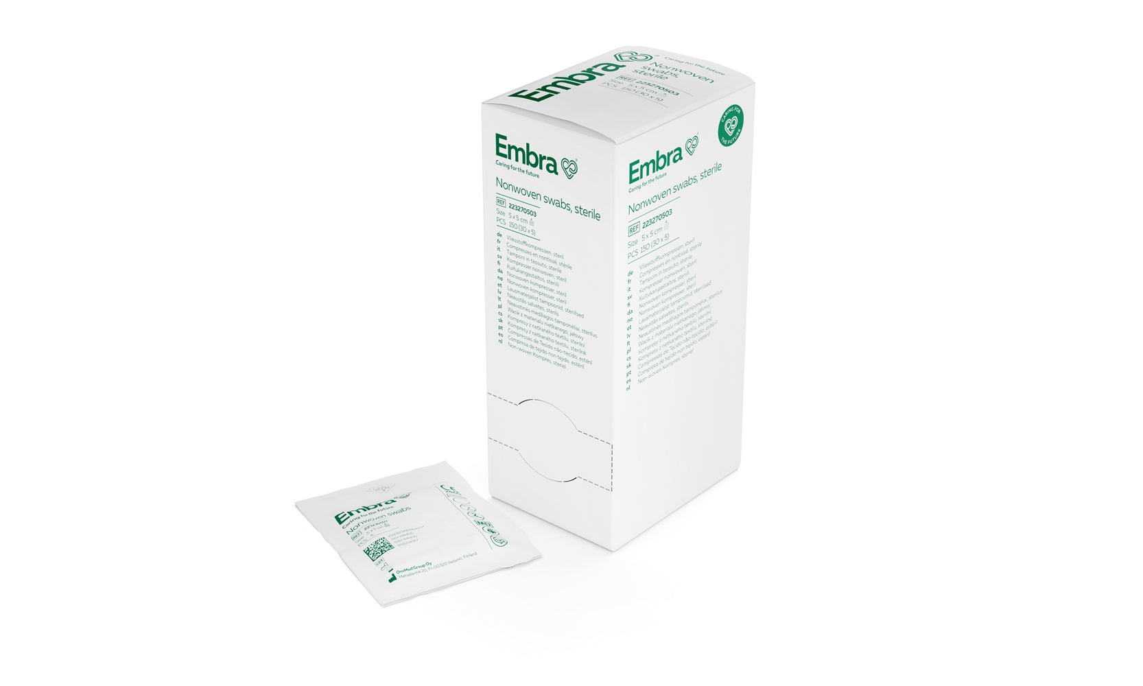 Embra® Nonwoven-kompresser, 4-lags, sterila är tillverkade av mjukt och mycket absorberande nonwoven-material. De används främst för rengöring och absorption av sårvätska och från sår och skrubbsår.